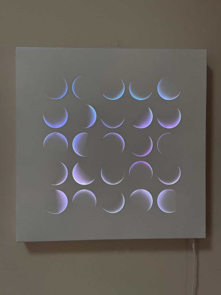 Apertures are enclosures that use various cutouts in metal to frame the color or animations programmed in the lights inside. Mini Turrells I call them, after the artist that makes some of the largest holes, punching them into walls or building structures to reveal spaces behind that are barely registering as space due to the way we see positive and negative space. Being small and much more portable, they give you much of the same feeling along with interesting plays with gestalt shapes and alignment.